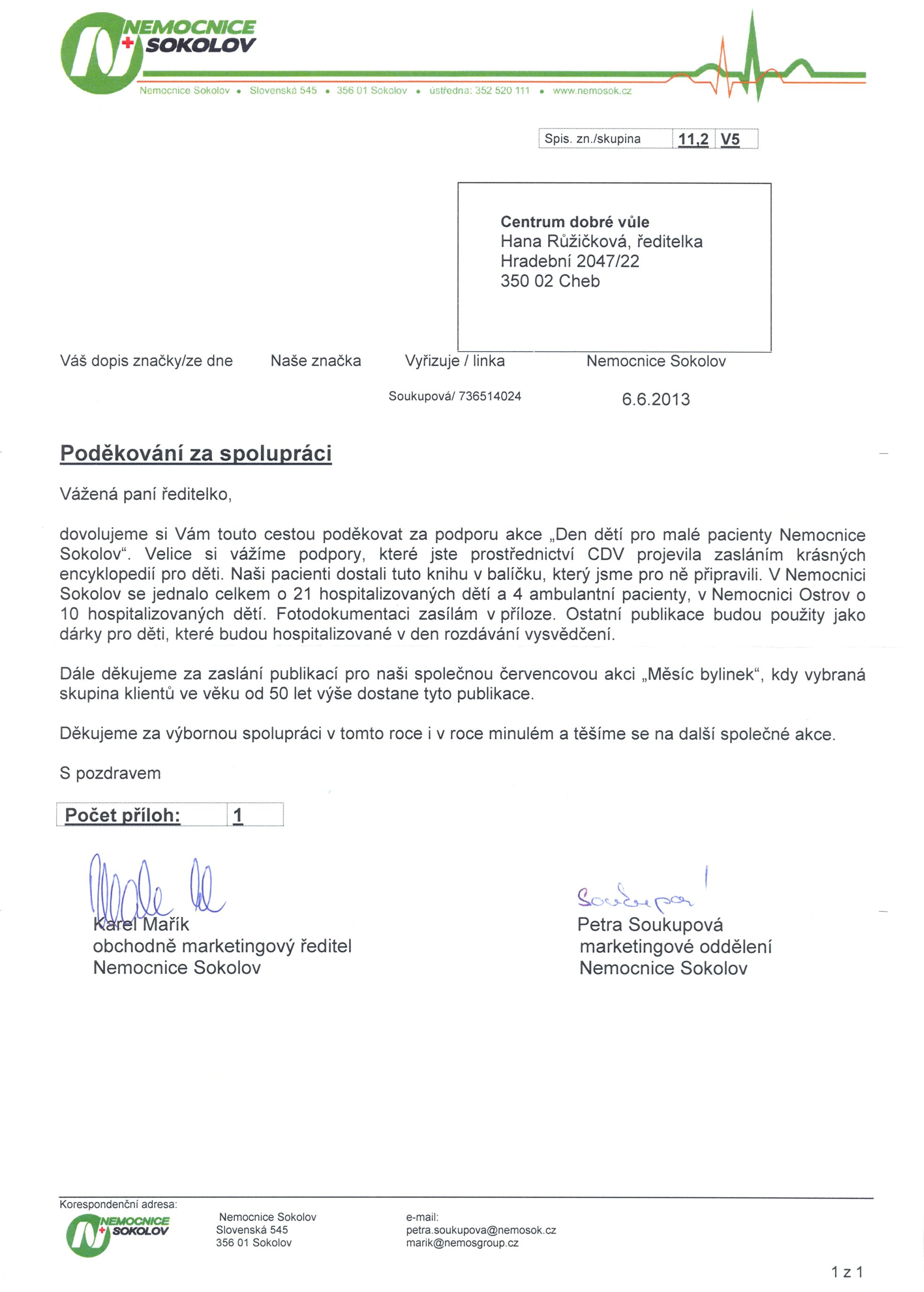 Poděkování za spolupráci od Nemocnice Sokolov můžete vidět přímo